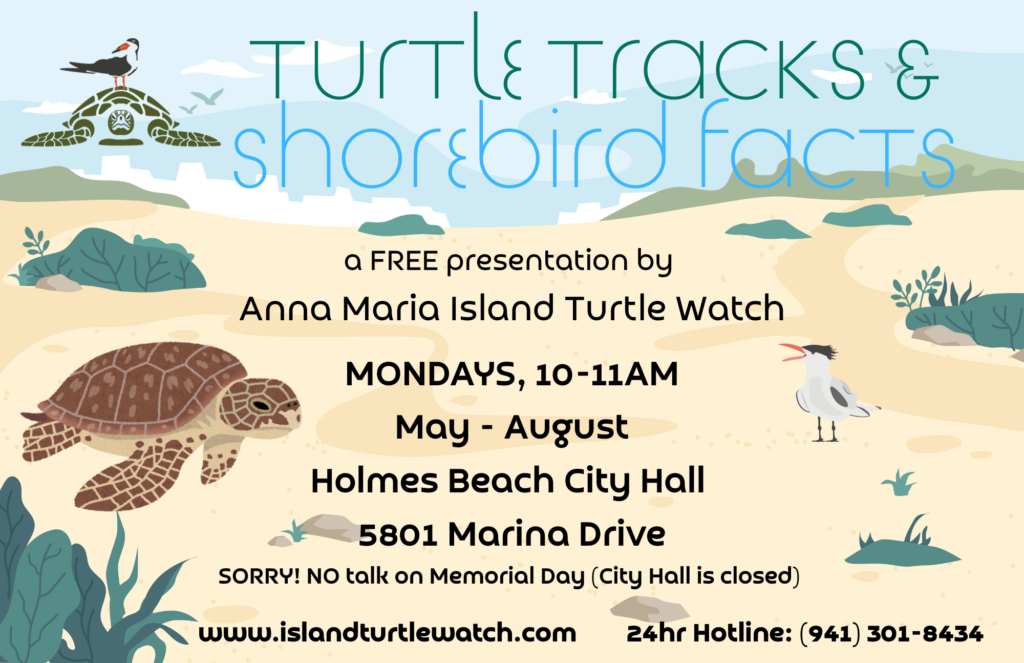 - Sea Turtle Tracks and Shorebird Facts talks are back starting May 4th! These fun and educational presentations put on by AMITW volunteers will be held May – August at Holmes Beach City Hall on Mondays from 10am – 11am (except for Memorial Day when City Hall is closed).