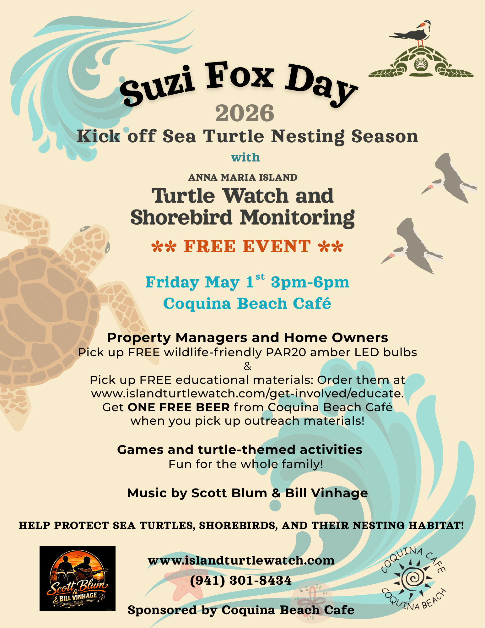 - Attend the 2nd Annual Suzi Fox Day – a Sea Turtle Nesting Season Kickoff Party which honors AMITW founder, Suzi Fox – will be held on May 1st from 3pm – 6pm at Coquina Beach Cafe. There will be FREE outreach materials and turtle friendly light bulbs, an educational booth, games and activities for kids, and music by Scott Blum & Bill Vinhage. Anyone who picks up educational materials gets a FREE BEER from Coquina Beach Café.